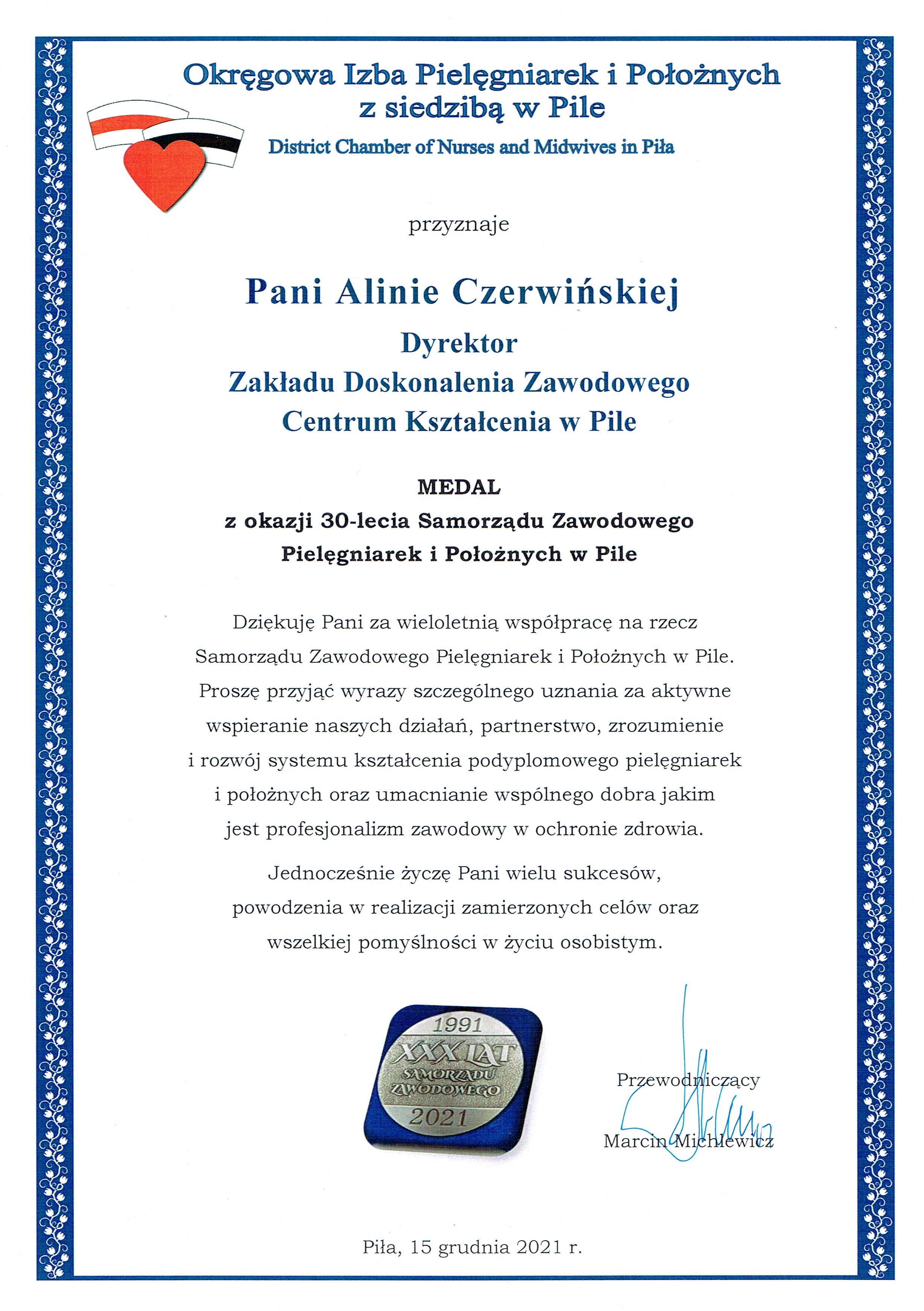 Gratulujemy pięknego jubileuszu 30-lecia istnienia Samorządu Zawodowego Pielęgniarek i Położnych w Pile, jak i życzymy wielu kolejnych sukcesów.